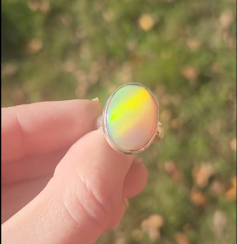 Beautiful iridescent color changing Aurora Opal crystal ring with stone set in a Sterling Silver band. This one of a kind stone ring features a large, polished oval shaped Aurora Opal flashing with a variety of vibrant colors and is available in size 7.25. Add this unique piece to your jewelry collection or give as a gift.
