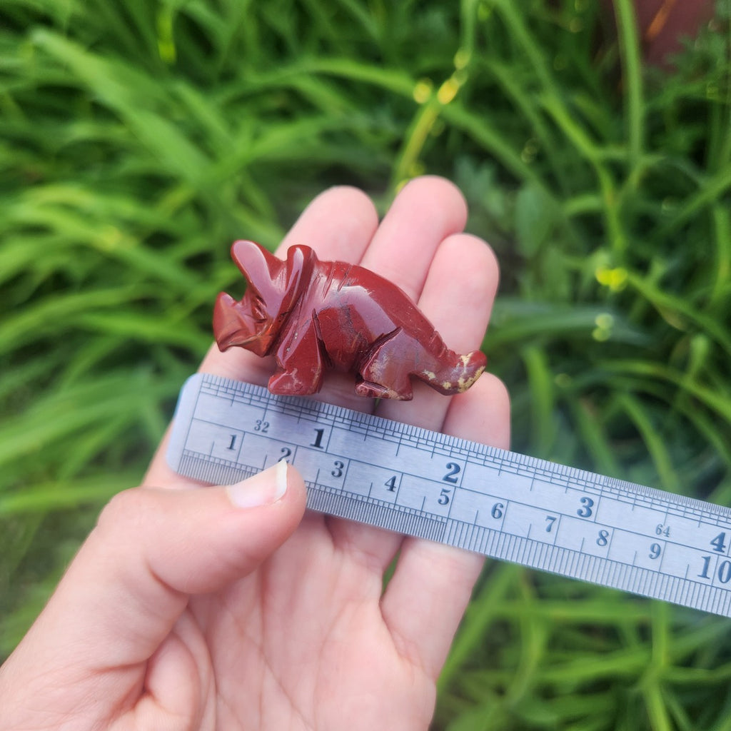 Your choice of a one of a kind carved stone dinosaur crystal figurine. You may choose between 4 different stone varieties in shapes of Triceratops, Brontosaurus, or Stegosaurus. Each small dinosaur statue is carved, polished, and features a cut base for displaying. This would make a lovely addition to your home decor, or a unique gift for a child or someone who adores dinosaurs.