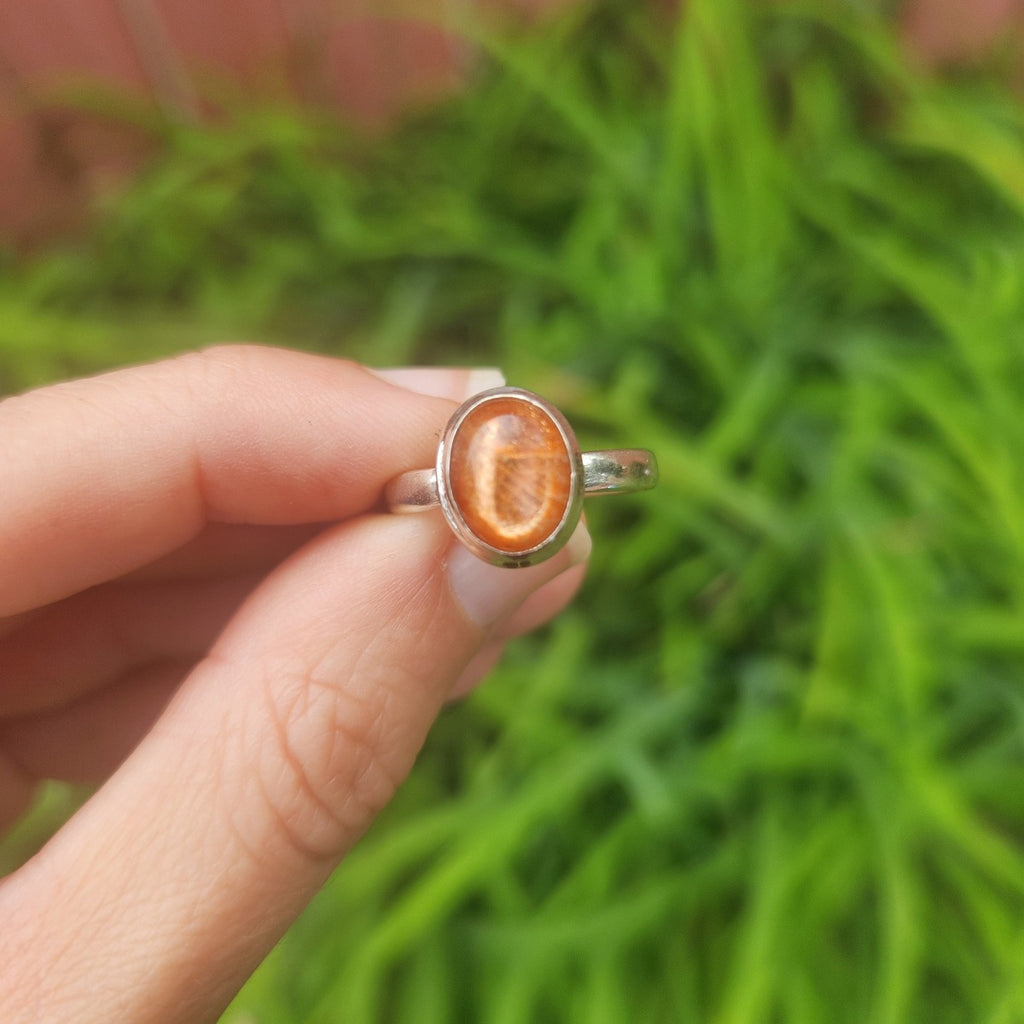 Beautiful shimmering Sunstone ring in Sterling Silver. This polished, oval shaped stone is set in a Sterling Silver band.. Add this one of a kind crystal ring to your jewelry collection, give as a gift, or wear to benefit from this stone's energy healing properties.